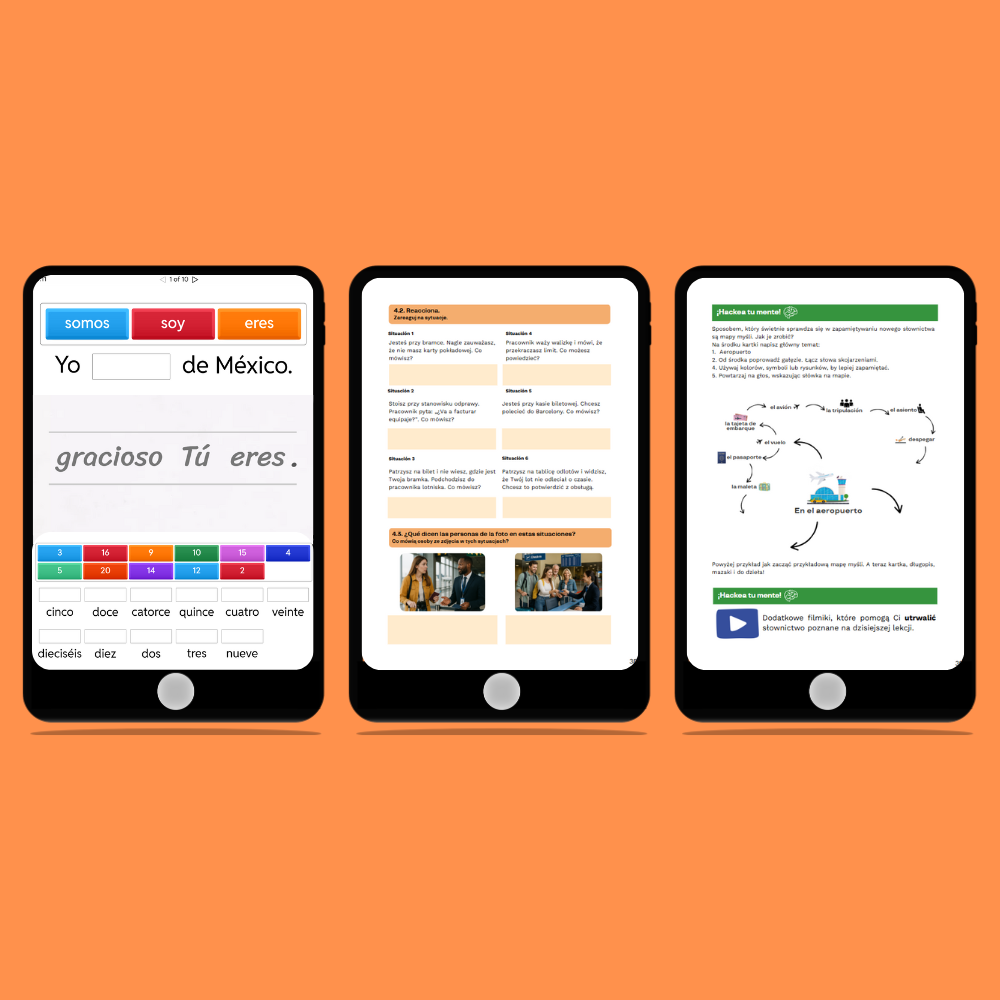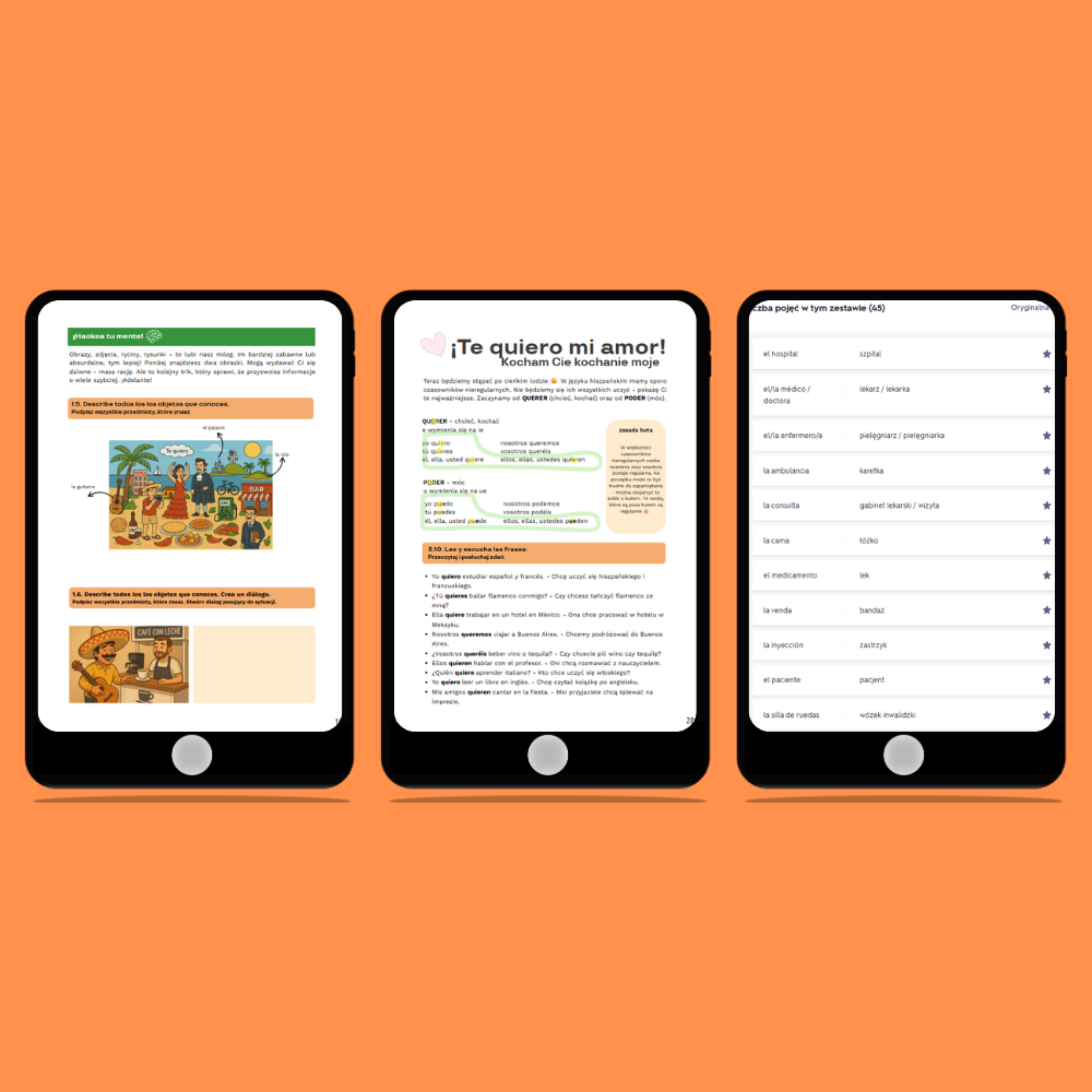 Nowoczesny i dokładnie zaplanowany e-book 📖. Uczysz się w sposób zgodny z tym, jak działa Twój mózg 🧠– przez powtarzalność, praktyczne small talki i sytuacje z życia oraz techniki skutecznej nauki. To książka, która umożliwi Ci dogadanie się w prostych codziennych sytuacjach (lotnisko, bar, restauracja, randka, hotel itp.) Dzięki licznym zadaniom, listom słówek, krzyżówkom oraz dialogom efektywnie utrwalisz materiał i zanurzysz się w hiszpańskim świecie 💃